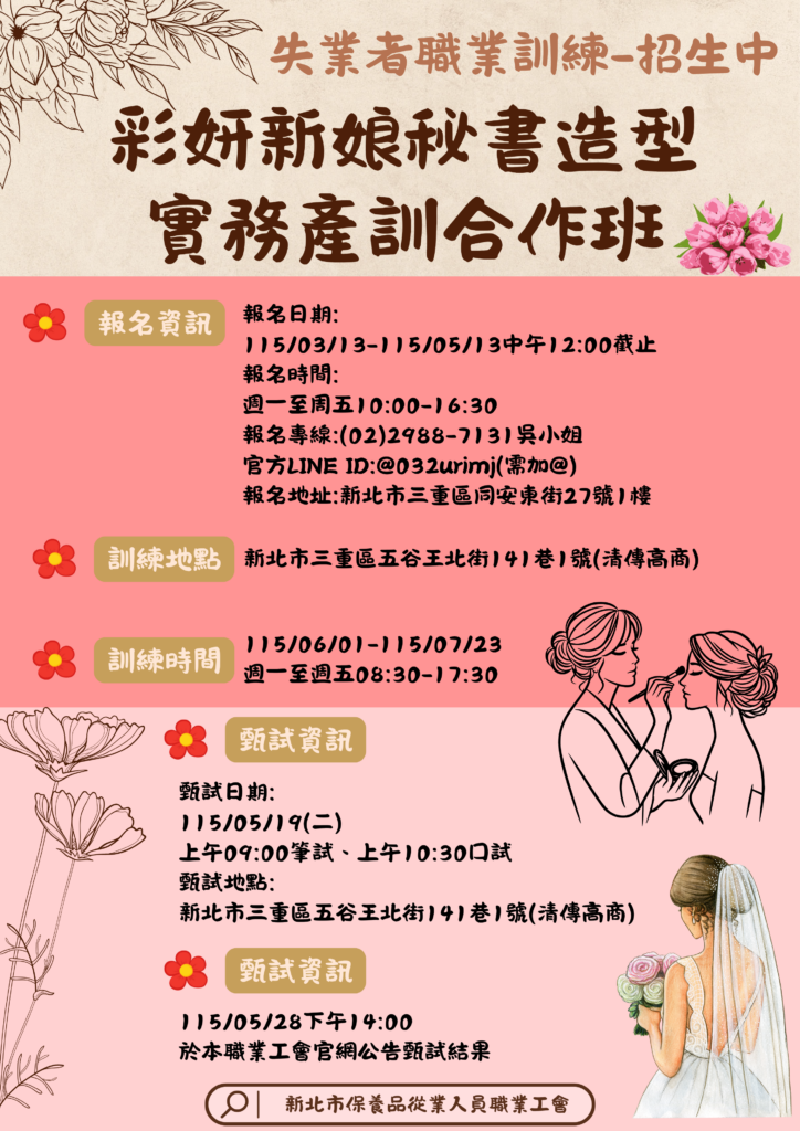 115年度失業者職業訓練-彩妍新娘秘書造型實務產訓合作班(招生中)